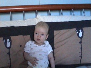 Vandaag was een erg warme dag. Tot wel 32 graden. Ik ben vandaag bij Happy Faces geweest, het kinderdagverblijf. Daar had ik het erg naar mijn zin. Ik heb in mijn wipstoeltjes alles eens goed bekeken en nog wat geslapen. De juffrouw dacht dat ik nog wat darmkrampjes heb gehad, maar erg veel last had ik daar niet van. Ik heb wel een beetje weinig gedronken, vond de juf. Thuis heb ik samen met mama lekker op bed gelegen en lekker geslapen: veel te warm om wat te doen. Achter het huis was het niet te harden.